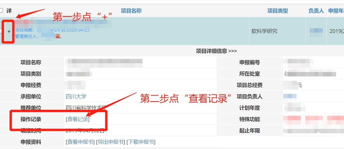 2.科技处将在8月24日(周三)进行集中审核。请项目负责人尽量提前完成在线提交,并即时关注申请书受理状态,如被退回修改的请根据意见(见下图,点击“操作记录”查看)及时修改提交。申请人如有意修改的,可联系科技处进行撤回(假期请尽量采取QQ、微信留言方式)。