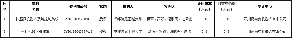 学校拟转让“一种服务机器人及其控制系统”等两项专利权,现将有关事项公示如下: