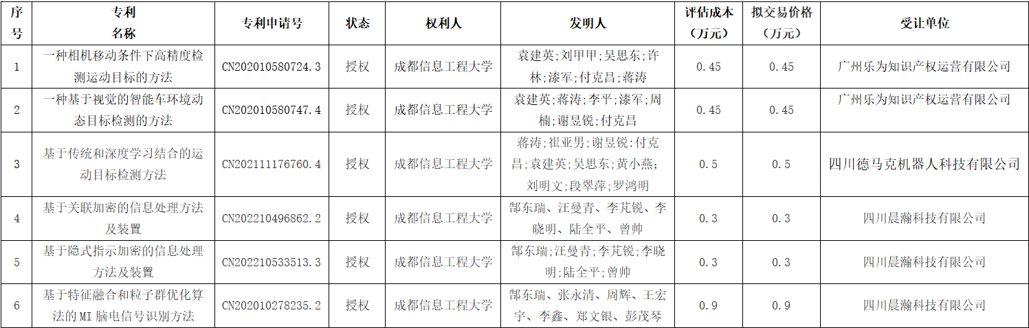 学校拟转让“一种相机移动条件下高精度检测运动目标的方法”等六项专利权,现将有关事项公示如下: