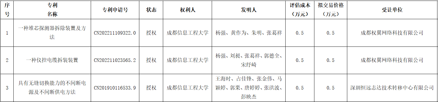 学校拟转让“一种堆芯探测器拆除装置及方法”等三项专利权,现将有关事项公示如下: