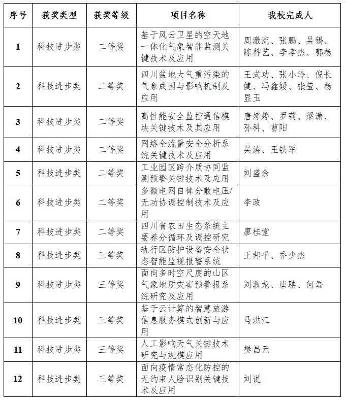 我校牵头申报的“基于风云卫星的空天地一体化气象智能监测关键技术及应用”“四川盆地大气重污染的气象成因与影响机制及应用”“高性能安全监控通信模块关键技术及其应用”3个项目获二等奖,“轨行区防护设备安全状态智能监视报警系统”“面向多时空尺度的山区气象地质灾害预警报系统研究及应用”2个项目获三等奖。我校获奖项目情况如下: