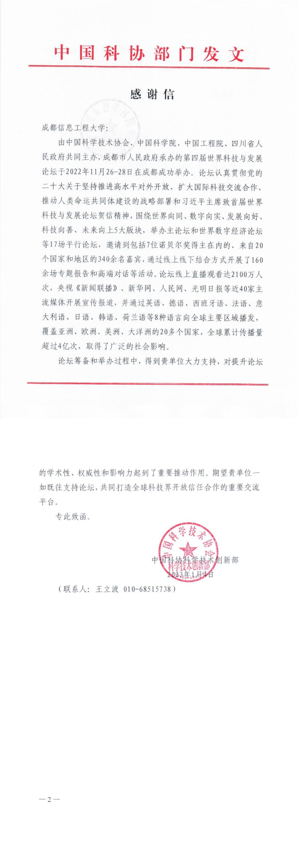 我校助力第四届世界科技与发展论坛收到中国科协感谢信